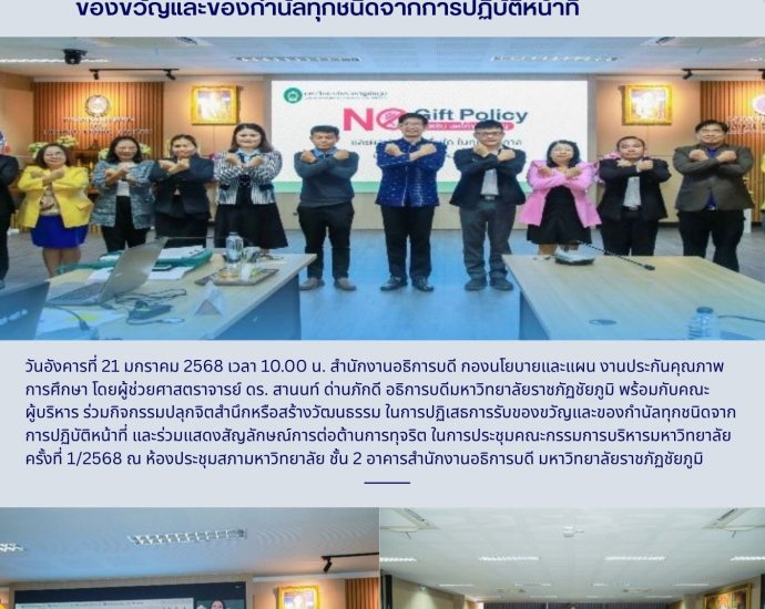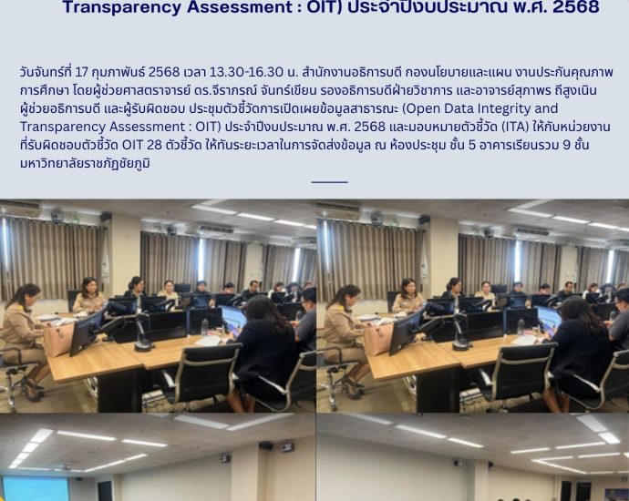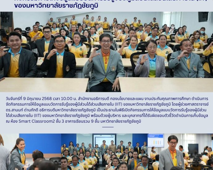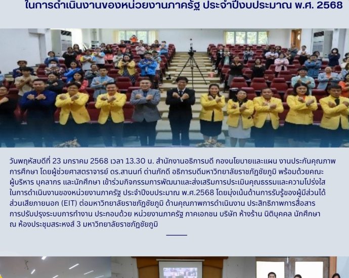 วันจันทร์ที่ 17 พฤศจิกายน 2568 เวลา 09.00 น. สำนักงานอธิการบดี มหาวิทยาลัยราชภัฏชัยภูมิ นำโดยนางอรุณี ปราบพยัคฆ์ รักษาการในตำแหน่งผู้อำนวยการกองกลาง และนางเกศราพร นาคคำ รักษาการในตำแหน่งผู้อำนวยการกองนโยบายและแผน พร้อมด้วยบุคลากรสำนักงานอธิการบดี ร่วมต้อนรับคณะกรรมการธรรมาภิบาล และจริยธรรมในการลงพื้นที่ติดตาม และประเมินการเปิดเผยผลการดำเนินงานตามแนวปฏิบัติตามหลักธรรมาภิบาลในสถาบันอุดมศึกษา หลักความรับผิดชอบต่อสังคม หลักเสรีภาพทางวิชาการ หลักความอิสระ และหลักความเสมอภาคของมหาวิทยาลัยราชภัฏชัยภูมิ ประจำปีงบประมาณ พ.ศ. 2568 ณ ห้องประชุม สภามหาวิทยาลัย ชั้น 2 สำนักงานอธิการบดี มหาวิทยาลัยราชภัฏชัยภูมิ Continue Reading