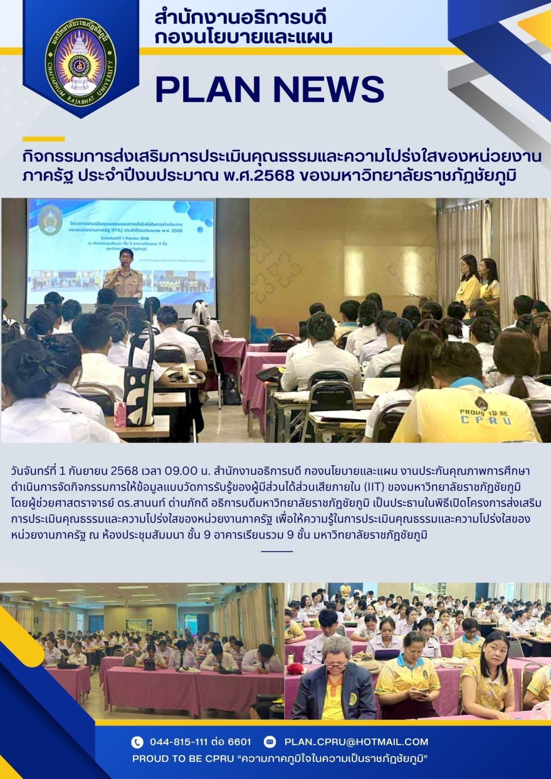 ระหว่างวันที่ 31 กรกฎาคม ถึง วันที่2 สิงหาคม 2568 ผู้ช่วยศาสตราจารย์ ดร.สานนท์ ด่านภักดี อธิการบดีมหาวิทยาลัยราชภัฎชัยภูมิ เป็นประธานเปิดโครงการ เพิ่มประสิทธิภาพการปฏิบัติงาน และการบริหารจัดการงาน สังกัดกองกองสำนักงานอธิการบดี มหาวิทยาลัยราชภัฏชัยภูมิ พร้อมด้วย ผู้ช่วยศาสตราจารย์ ดร.ศักดิ์ชาย เพ็ชรตรา รองอธิการบดีฝ่ายบริหาร ผู้ช่วยศาสตราจารย์ ดร.ฉัตรณรงค์ศักดิ์ สุธรรมดี ผู้ช่วยอธิการบดี และนางอรุณี ปราบพยัคฆ์ รักษาการในตำแหน่งผู้อำนวยการกองกลาง และบุคลากรกองกลาง สำนักงานอธิการบดี ร่วมกัน ถอดบทเรียนและแลกเปลี่ยนเรียนรู้ เรื่องการนำแนวปฏิบัติที่ดีมาปรับใช้ในงาน จากการไปศึกษาดูงาน มหาวิทยาลัยสวนดุสิต ศูนย์การศึกษานครนายก ณ วังยาวริเวอร์ไซด์รีสอร์ท จังหวัดนครนายกContinue Reading