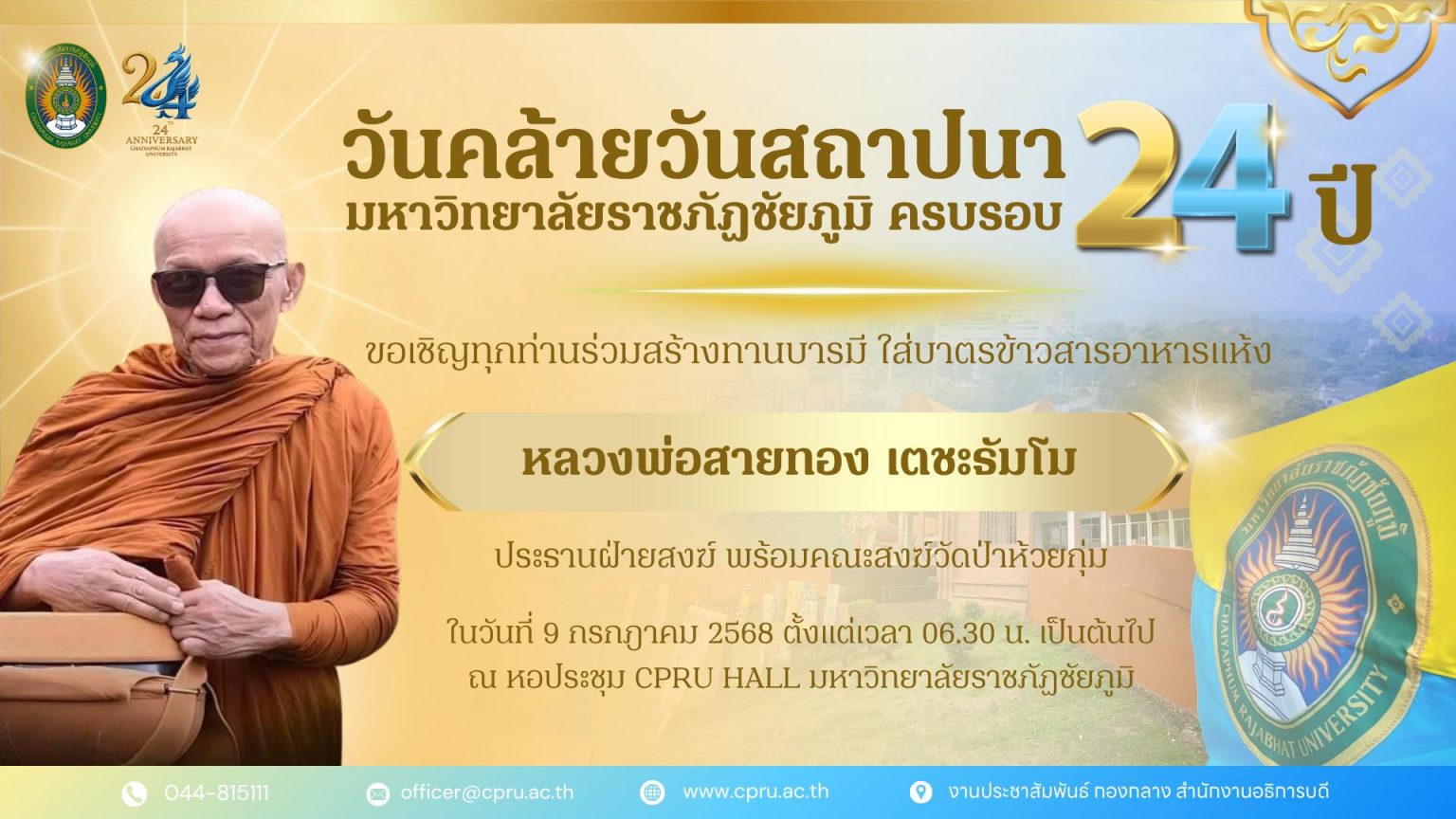 วันคล้ายวันสถาปนามหาวิทยาลัยราชภัฏชัยภูมิ ครบรอบ 24 ปี ขอเชิญทุกท่านร่วมสร้างทานบารมี ใส่บาตรข้าวสารอาหารแห้ง “หลวงพ่อสายทอง เตชะธัมโม” ประธานฝ่ายสงฆ์ พร้อมคณะสงฆ์วัดป่าห้วยกุ่ม ในวันที่ 9 กรกฎาคม 2568 ตั้งแต่เวลา 06.30 น. เป็นต้นไป ณ หอประชุม CPRU HALL มหาวิทยาลัยราชภัฏชัยภูมิContinue Reading